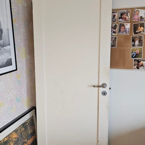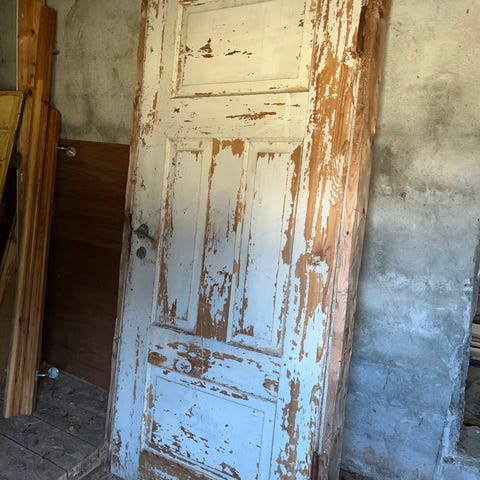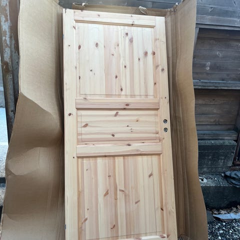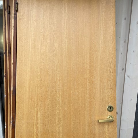 Eldre dørblad med bredde på 59 cm, høyde 198 cm. Døren har hengsler montert, hengsler til karm følger med. Original trefarge på den ene siden og hvitmalt på den andre siden.