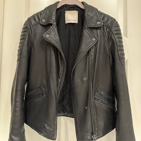 Gestuz skinnjakke i svart farge, størrelse XS for dame. Jakken er laget av skinn og har glidelåslommer foran.