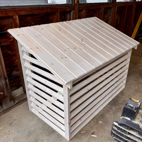 Varmepumpehuset er beskyttet med grunning og er klart til maling.