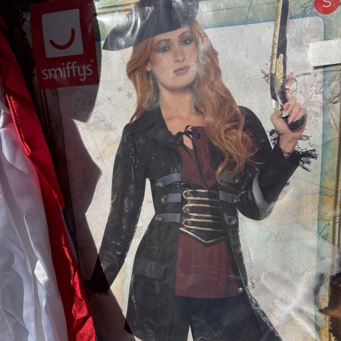 Piratkjole med pannebånd i str.128. Kostymet mangler korsettet som er avbildet på pakken. Ikke brukt, kun åpnet.