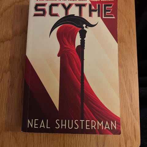 Neal Shusterman Scythe roman. Inneholder temaer om kontroll og død, skrevet på engelsk.
