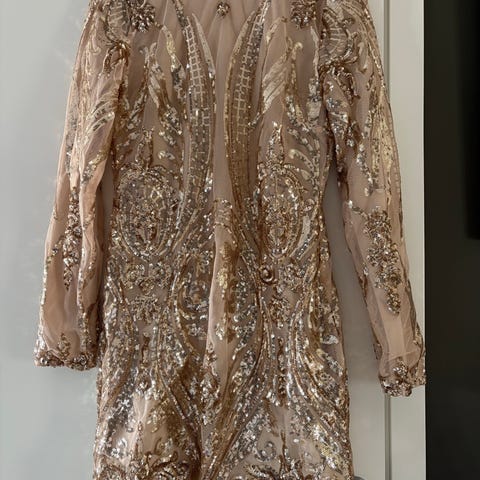 Nelly festkjole i størrelse M, rosa farge og laget av paljetter. Kjolen har lang erm og v-utringning, egnet til formelle anledninger.