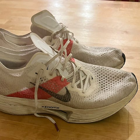 Nike Air Zoom Alphafly Next% 3 løpesko i størrelse 42. Skoene er designet for løping og har en kombinasjon av materialer som gir støtte og komfort under trening og konkurranse.