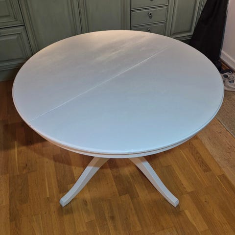 Rundt spisebord i lakkert eikefiner hvitpigmentert inkludert 1 ileggsplater med ben heltre eik.