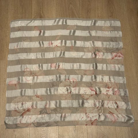 78*78cm merket som viser silkemateriale mangler, håndsydd kant. Skjerfet er tynt, kan se annerledes ut på bildet på grunn av lysforholdene.