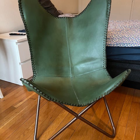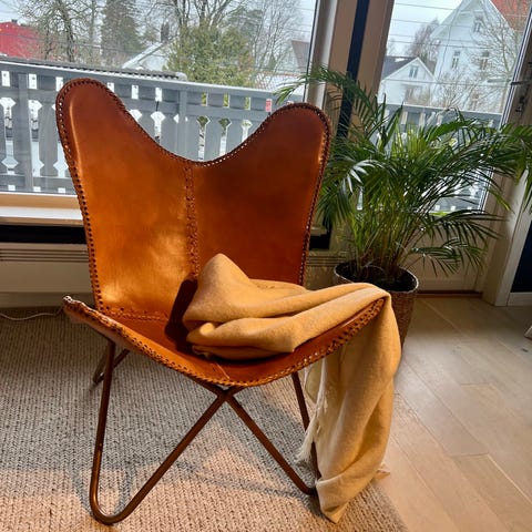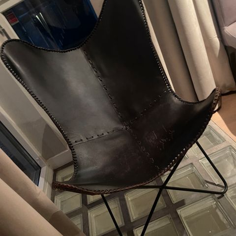 Vakker butterfly stol i kamelskinn. Stolen er håndlaget på Sri Lanka. Skinnet kan behandles hvis man ønsker en mer jevn farge.