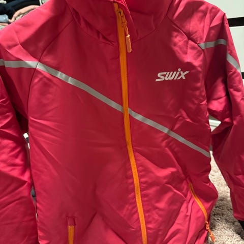 Swix jakke i rød og svart farge. Jakken har glidelåslommer og refleksdetaljer for økt synlighet. Materialet er lett og pustende, egnet for utendørsaktiviteter.