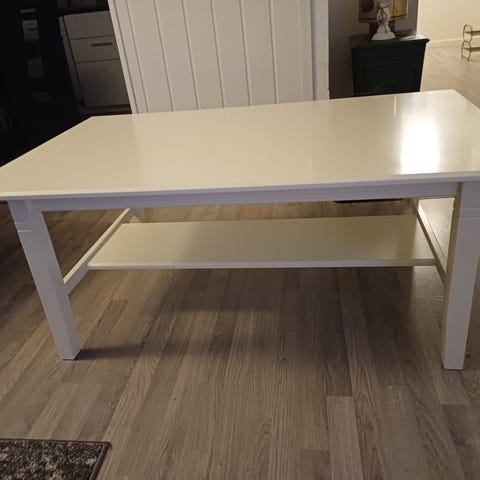 I metall, ganske lett. Enkelt og stilrent med praktisk bladhylle under bordplaten. Må hentes på Jonsvatnet/ Reppe
