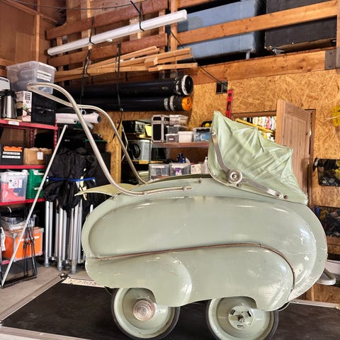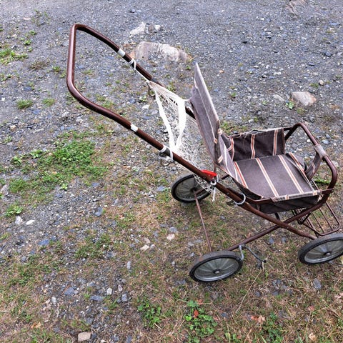 Fremstår forholdsvis hel, med original madrass. Bremsene og fjærene virker.