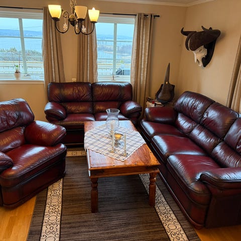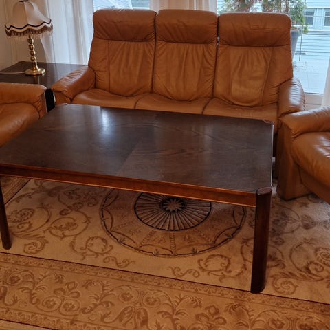 Komplett skinnsalong med tilhørende bord, pent brukt og i svært god stand. Moderne og elegant design som gir stuen et luksuriøst preg, samtidig som det er komfortabelt for avslapning og sosialt samvær.
