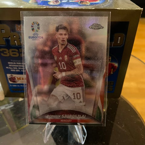 Topps Chrome Milos Kerkez fotballkort fra Euro 2024 Kortet viser Milos Kerkez i Ungarns landslagsdrakt med nummer 11. Kortet har holografisk design og inkluderer statistikk og informasjon på baksiden.