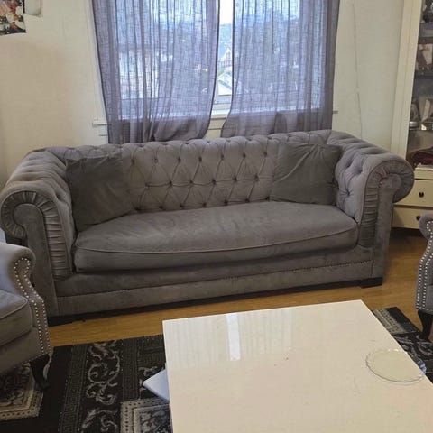 Vi er en familie som stort sett sitter rundt kjøkkenbordet, så sofaene har praktisk talt ikke vært brukt særlig mye. Unntaket er lenestolen, som har vært brukt litt mer og har en litt løs del, og det kan mest sannsynlig strammes enkelt.
