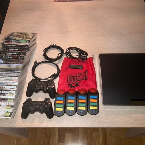 PS3 Original med 8 actionspill og 2 kontrollere – Red Dead, Metal Gear m.m.