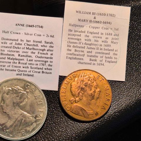 Dette er en antikk britisk mynt, sannsynligvis en James II Half Crown fra slutten av 1600-tallet.