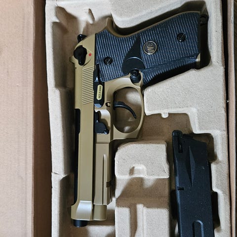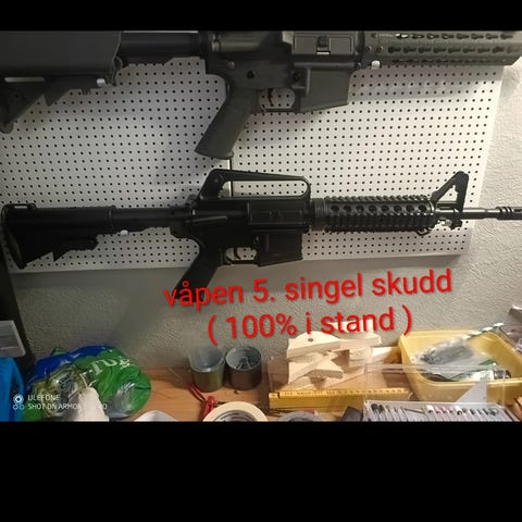 Pistolen er en springer, som vil si den må lades på toppen for hver gang du skal avfyre. Den har ca. 20 kuler kapasitet i magasinet og er en fin liten ting til blinkskyting. Annonsen på innebærer det som er vist på bilde.- det vil si tofotstøtte (bipod) på rifla og et magasin til hver av våpnene.