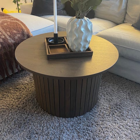 Selger sofabord / salongbord i eikefiner med sorte pent. Veldig pent. Kan være behjelpelig med levering mot tilskudd i pris