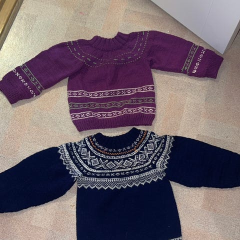 Hjemmestrikka gensere strl 2-3 år selges billig. 300kr per stk.