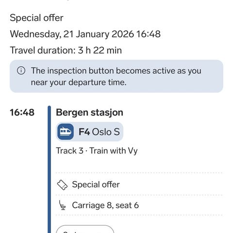 Vy togbillett for reise mellom Voss og Oslo S. Billetten gjelder for 2 voksne på avgang 22. januar kl. 07:28.