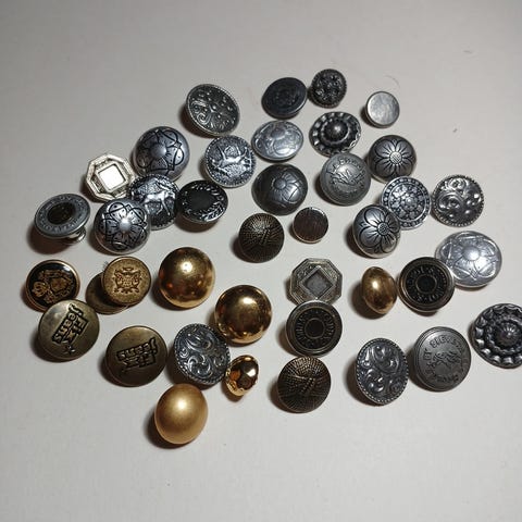 Pris ved hvert bilde. 300,- for alle tre pakkene sammen. I pakken med metallknapper er det nok et par knapper som vil se ut som metall, men er nok heller plast. Men de fleste er metall.