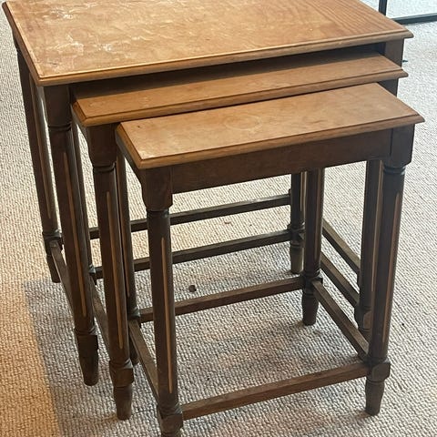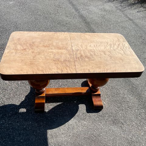 Bordet er i god brukt stand sett i lys av alder. Det finnes normale bruksspor som mindre merker, patina og noe aldersrelatert slitasje i overflater og kanter. Ingen løse deler eller strukturelle skader. Bordet er stabilt og fullt brukbart.