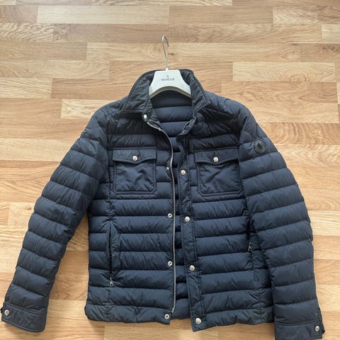Moncler vest i størrelse S-M for herre, laget av nylon. Vesten har en grønn farge og er designet for utendørs bruk. Innvendig fôr med illustrasjoner er synlig på bildene.