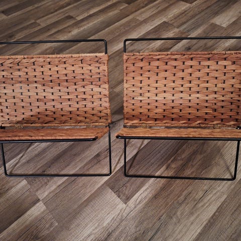 Kul retro/vintage avisholder laget i hvit metall og fleksibel kunststoffbånd for oppbevaring av aviser eller magasiner. Enkelt og funksjonelt design, der bøyler/bånd holder materialet på plass. Egnet for bruk i hjem eller kontor!