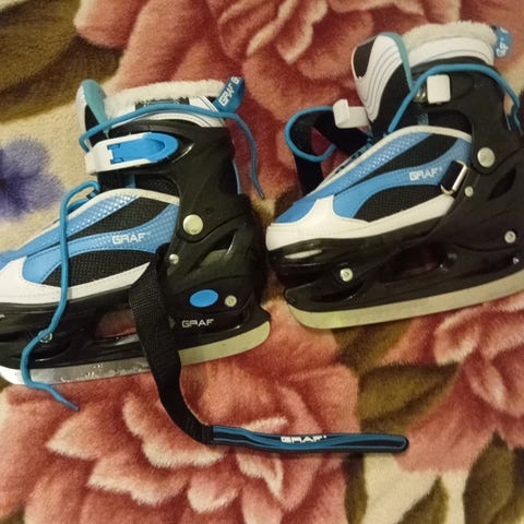 Graf Ishockey skøyter i størrelse 35 for barn. Skøytene har svart og hvit farge og er egnet for ishockey. De har justerbare spenner for god passform.