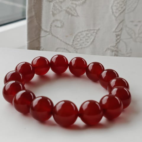 Enkel eleganse - håndlaget armbånd av naturlig rød agat med dyp glans og levende fargespill. Perler ca. 10 mm, elastisk og komfortabel størrelse ca. 18,2 cm. Elastisk strikk.
