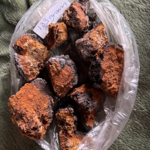 Chaga sopp tørr rå naturprodukt. Produktet består av tørket chaga sopp som kan brukes til te og helseformål.
