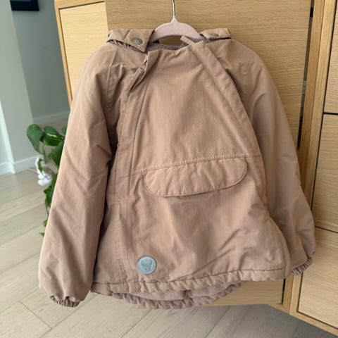 Wheat barn vinterjakke i størrelse 104, farge rosa. Jakken har hette med avtagbar pelskant og elastiske mansjetter.