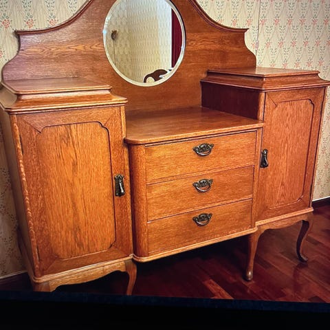 Meget pen skjenk bredde 180cm høyde 93cm dybde 50 cm pris 1000.- Speil bredde 160cm høyde 105cm pris 500.-