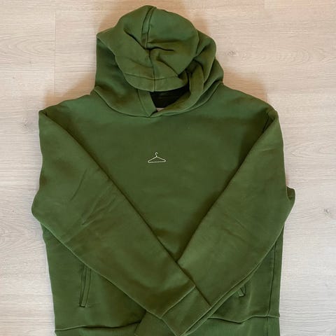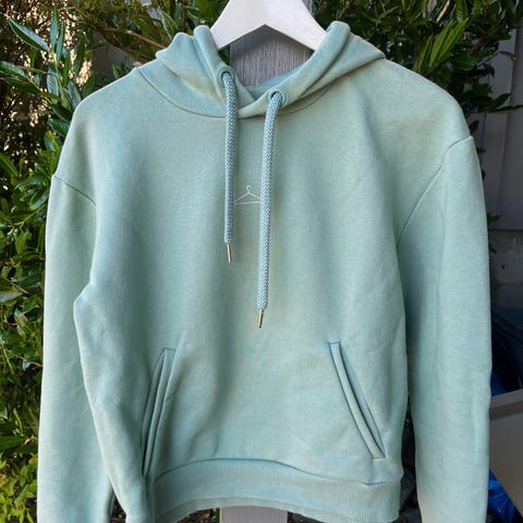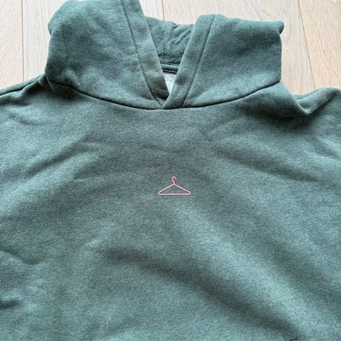 Holzweiler hettegenser i størrelse S for kvinner. Genseren er grønn og laget av bomull. Den har hette og en enkel brodert detalj på brystet. Pent brukt, selges pga for liten størrelse.