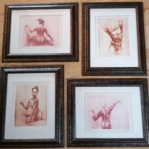 Selger fire originale mixed media-verk med stiliserte dyremotiver i gull på sort bakgrunn – en giraff, en elefant, en apekatt i bananskall og en enhjørning. Hvert bilde er håndlaget med en kombinasjon av teknikker som gir en elegant, men leken finish. Motivene er enkle, men uttrykksfulle.