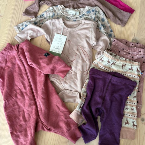 Liten klespakke med ull. En lite brukt ulldress fra Lindex (noen nupper kan fremkomme), en body fra Joha og en bukse fra Name it.