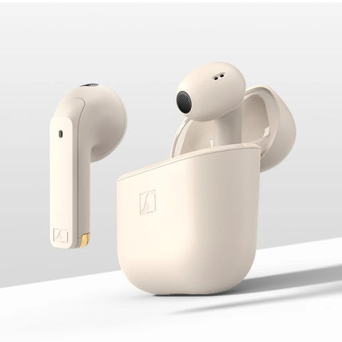 Sennheiser trådløse ørepropper med kompakt ladeetui. Produktet inkluderer to ørepropper og et etui for lading og oppbevaring. Designet for trådløs bruk med fokus på lydkvalitet og bærbarhet.