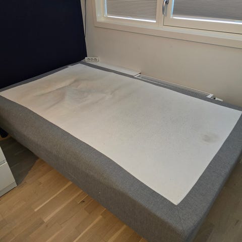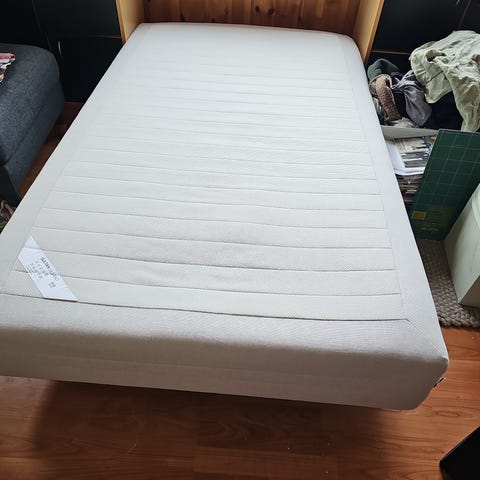 IKEA madrass med størrelse 120x200 cm. Grå farge med mønster. Passer til enkeltseng eller gjesteseng. Hentes idag