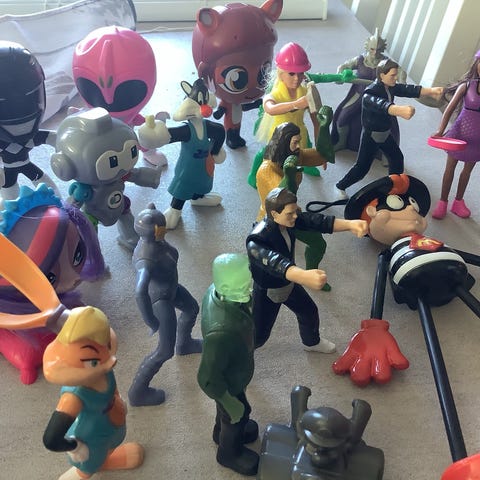 Samling av ulike actionfigurer i forskjellige størrelser og farger. Figurenes materiale og eksakte merker er ikke oppgitt. Figurenes design varierer og inkluderer både superhelter og andre karakterer.