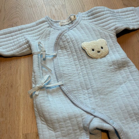 Selger en nydelig omslagsbody/romper til baby i str 0-3 mndr. Vi rakk kun å bruke den en gang, så den er så god som ny. Vasket med parfymefritt vaskemiddel 1 gang. Fra Bella Bambini.