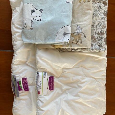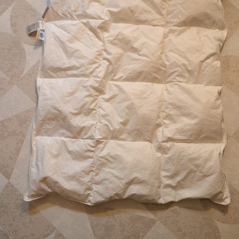 Babydyne i dun 65x80 kjøpt på Kid. Følger med et dynetrekk med inntakt glidelås og et helseteppe. Kun brukt i vogn og vugge.