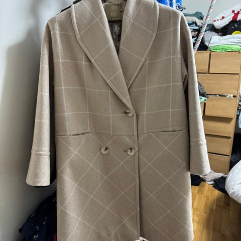 Flott kort kåpe selges. Str. 44. Klassisk og tidløs modell som sitter pent på. Kåpen har avtagbart kanin skinn, som gjør den like anvendelig både høst, vinter og tidlig vår.