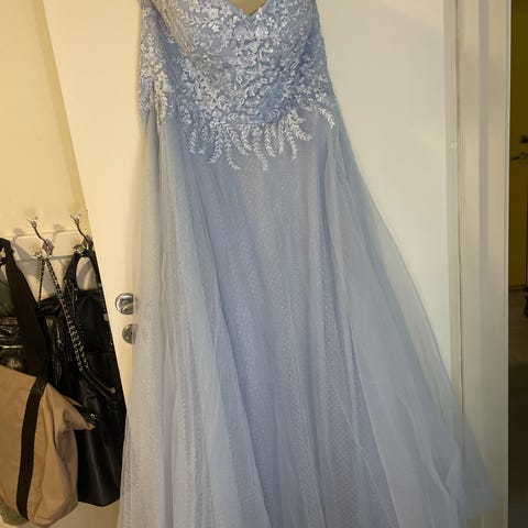 Nydelig ballkjole. Knyting bak. Passer fra XS til M , den er champagnefarget. Det er syv lag med tyll og stoff i skjørtet. Bittelitt selvbruning på innsiden av toppen. Vises ikke når den er på. Litt svake flekker nederst på kjolen, vises heller ikke når den er på. Jeg ønsker bud men ikke mindre enn 1500,- kan sende. Flere bilder kommer. Helt øverst i knytingen er det en liten slitasje. Se bilde. Det følger med pose til kjolen og underskjørt med to spiler og tyll for ekstra fluff i kjolen.