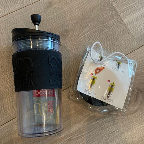 Selger en veldig fin Bodum Travel Press i en stilren beige/grå farge. Koppen er brukt ved noen få anledninger, men den har blitt tatt svært godt vare på.