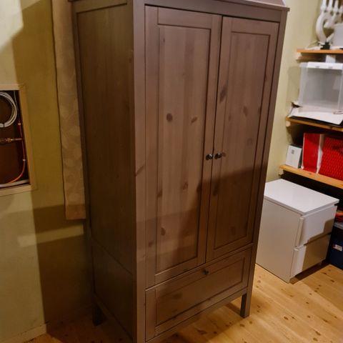 Klistremerkene kan tas av hvis du ønsker og det vil ikke være merker igjen etter de. Pitteliten skramme på rammen- se bilde ellers fremstår den som ny. Madrass (fra yngri), beskyttelse laken og to stk rosa laken kan følge med om ønskelig. Alt av skruer og deler følger med for å sette den opp for nyfødt. Har nok bruksanvisning et sted om ikke så ligger den på IKEA sine sider.