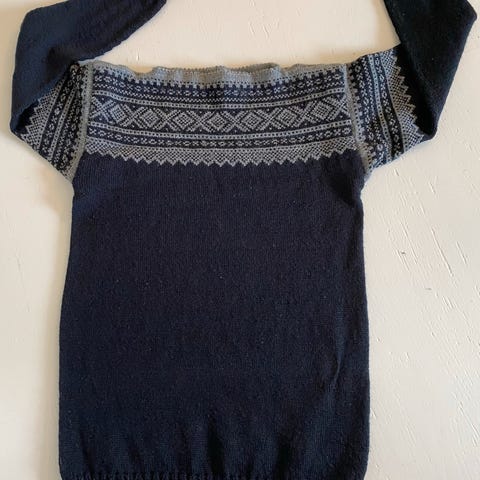 Nesten ubrukt. Offwhite/lilla ullgenser. Mariusmønster. Vaskes på 30 grader ullvask. Innsvinget under bryst.