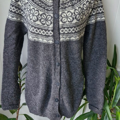 Multifarget ulljakke m/hette. Håndstrikket alfa. God og varm på vinteren.