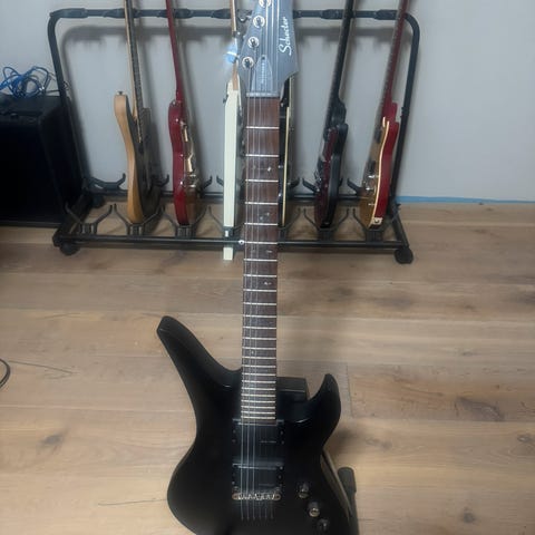 Schecter elektrisk gitar i hvit farge. Gitaren har seks strenger og en kropp med dobbel cutaway design. Den er utstyrt med justerbare stemmeskruer og elektroniske komponenter plassert på baksiden. Passer for bruk i ulike musikkstiler som krever elektrisk gitar.