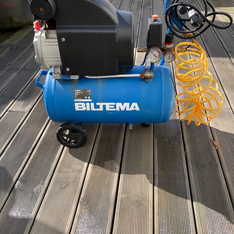 Basic Kompressor 2HK luftkompressor med rød tank. Kompressoren har en effekt på 2 hestekrefter (HK) og opererer på 230V, 50Hz. Maks trykk er 115 PSI (7,8 bar) og luftstrømmen er 6,3 CFM ved maksimalt trykk og 5,2 CFM ved 40 PSI. Luftkompressoren er utstyrt med hjul for mobilitet.
