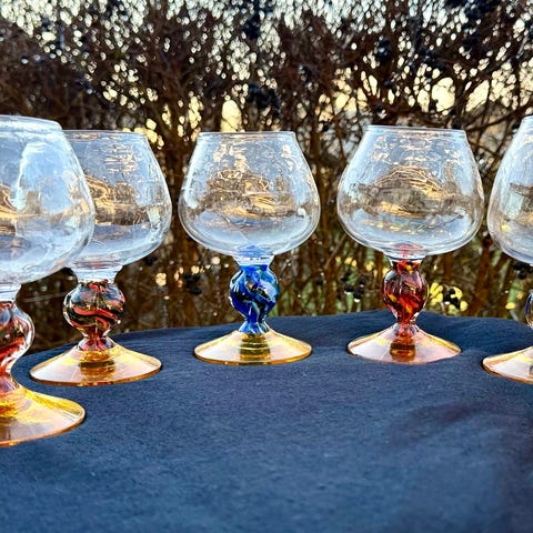 Selger 4 helt nye og ubrukte kunstglass laget av glassblåser og kunstner Irene Harvik. Høyden er 20-21 cm. De har litt ulik høyde slik kunstglass skal være. Ønsker helst å selge dem samlet, men de kan også selges enkeltvis. Pris per glass er 350 kr. Samlet pris 1100 kr.