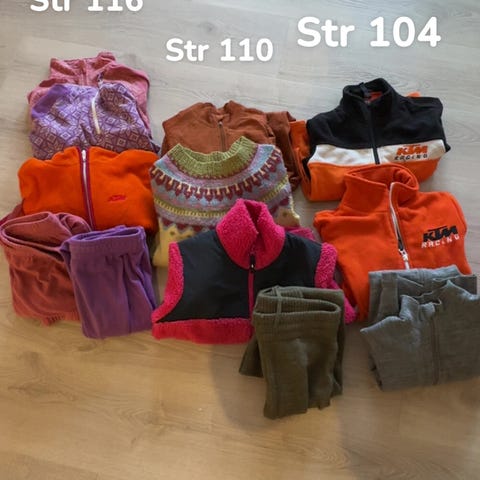 Div fleece gensere, 1 fleece bukse, 1 hjemmestrikket ullgenser, votter