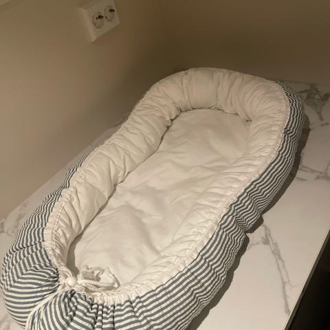 Brukt av et barn. Okergul/ cognac farge ( kan dekkes over med teppe). Trekket kan tas av og vaskes. Mye bruk igjen. Kjekt som ekstra.